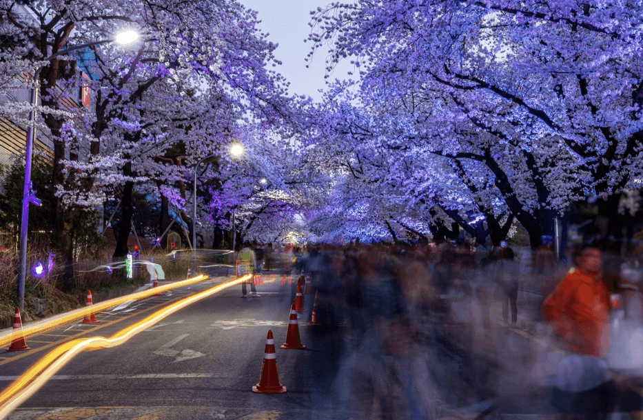 해가 지면 조명으로 물든 벚꽃길은 진정한 사진 맛집! 인생샷 건지기 딱 좋아요.